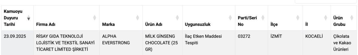 Tarım ve Orman Bakanlığı'nın sağlığı tehlikeye atan firmalar listesine Kocaeli'den giren Risay Gıda Teknoloji Lojistik ve Tekstil Sanayi Ticaret Limited Şirketi, Alpha everstrong markalı, 25 gram "milk ginseng chocolate" ürününde "ilaç etken maddesi" tespit edildi.
