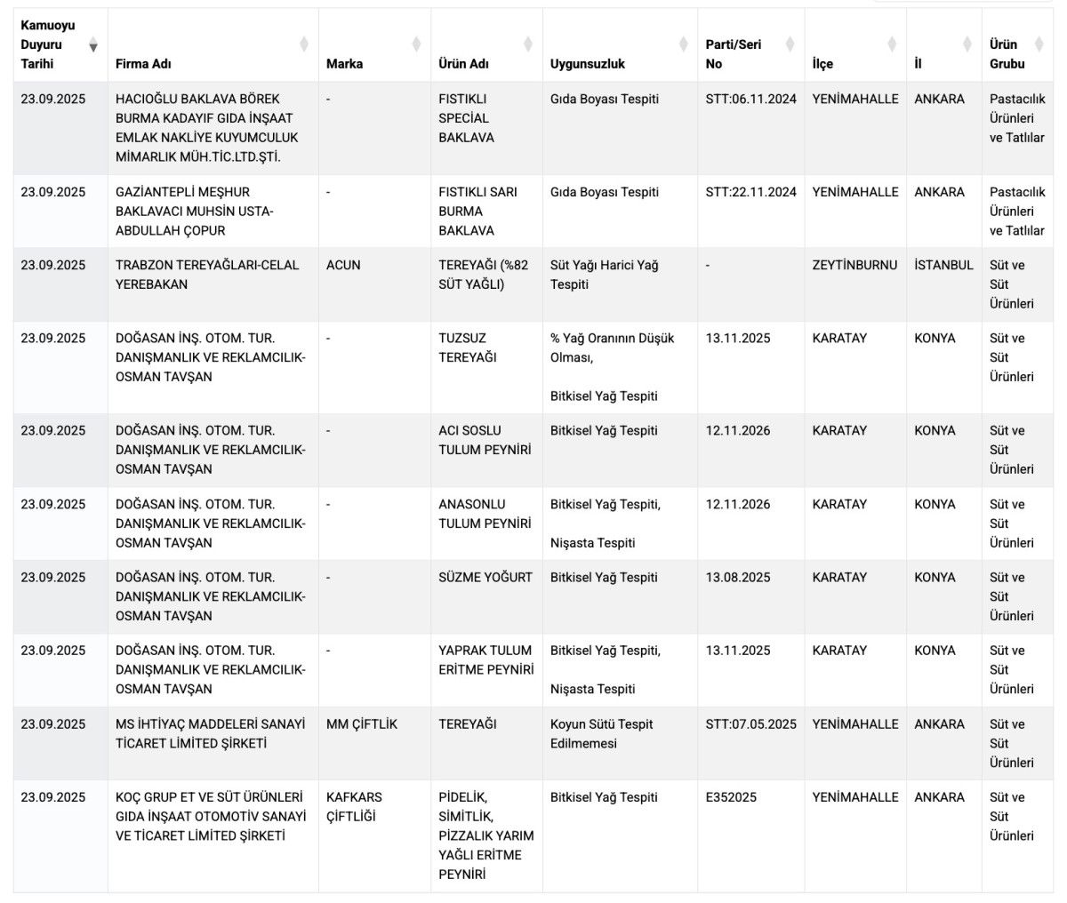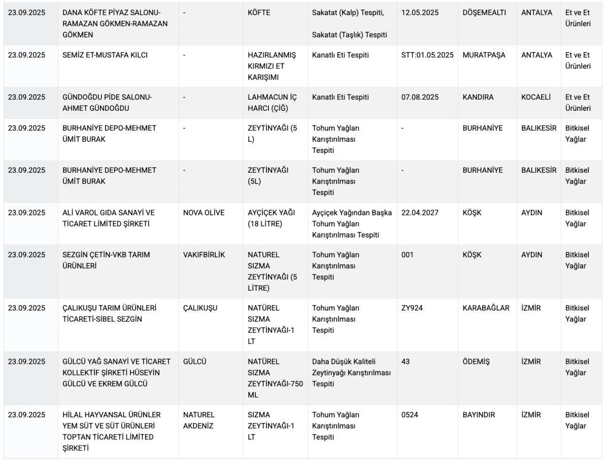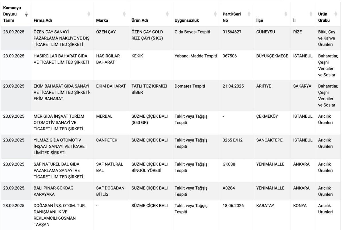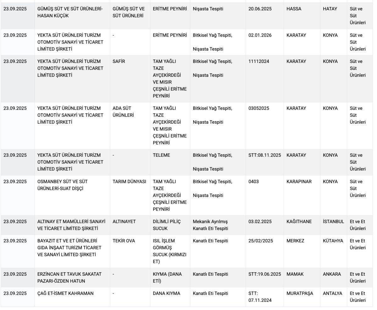 Tarım ve Orman Bakanlığı’nın sağlığı tehlikeye atan firmalar listesine yeni çikolata ve kakao ürünlerileri, pastacılık ürünleri ve tatlılar, et ve et ürünleri, bitkisel yağlar, bitki, çay ve kahve ürünleri, baharatlar, çeşni vericiler ve soslar, arıcılık ürünleri, süt ve süt ürünleri ve firmalar katıldı.