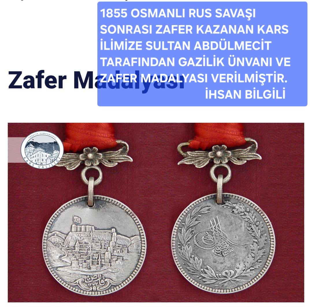 Kars'ın Rus Ordularına karşı kahramanca savunulması sonucunda; kazanılan 1855 Kars Zaferi nedeniyle, şehrimize verilen. "Kars Zafer Madalyası" aynı zamanda Anadolu’da bir şehre verilen ilk Gazilik Madalyasıdır.