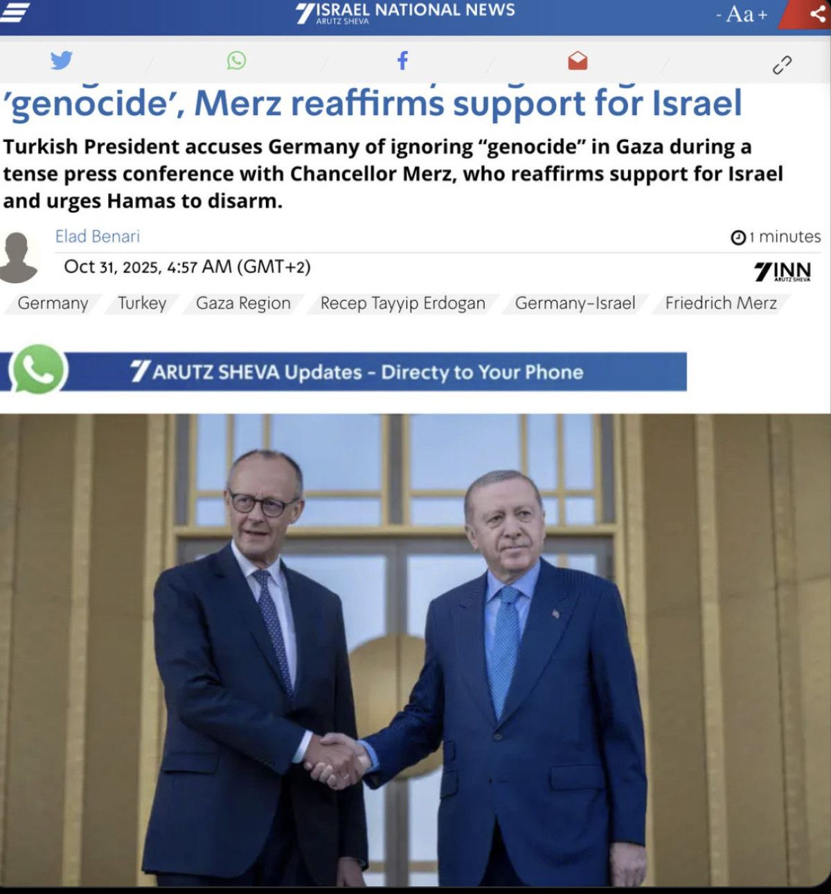 Israel National News, "Erdoğan, Almanya'yı Gazze'deki 'soykırımı' görmezden gelmekle suçladı, Merz İsrail'e desteğini yineledi." açıklamasında bulundu.