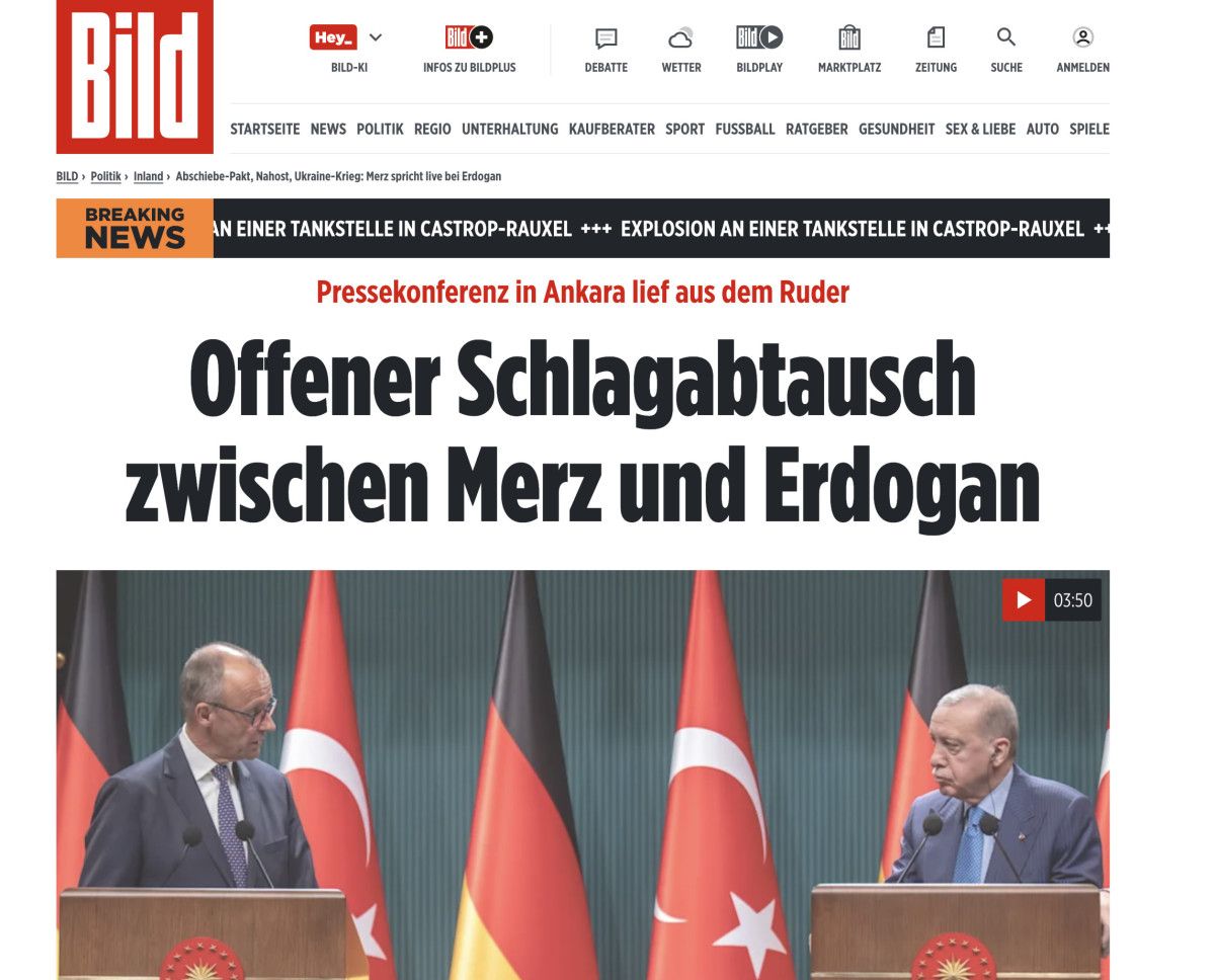 Bild, haberinde Merz'in ziyaretinin temel gündeminin "göç, sınır dışı süreçleri ve Ukrayna savaşı" olduğunu, Erdoğan'ın ise "Gazze'de barış ve insani yardımların sürekliliği" konusuna odaklandığının altını çizdi.