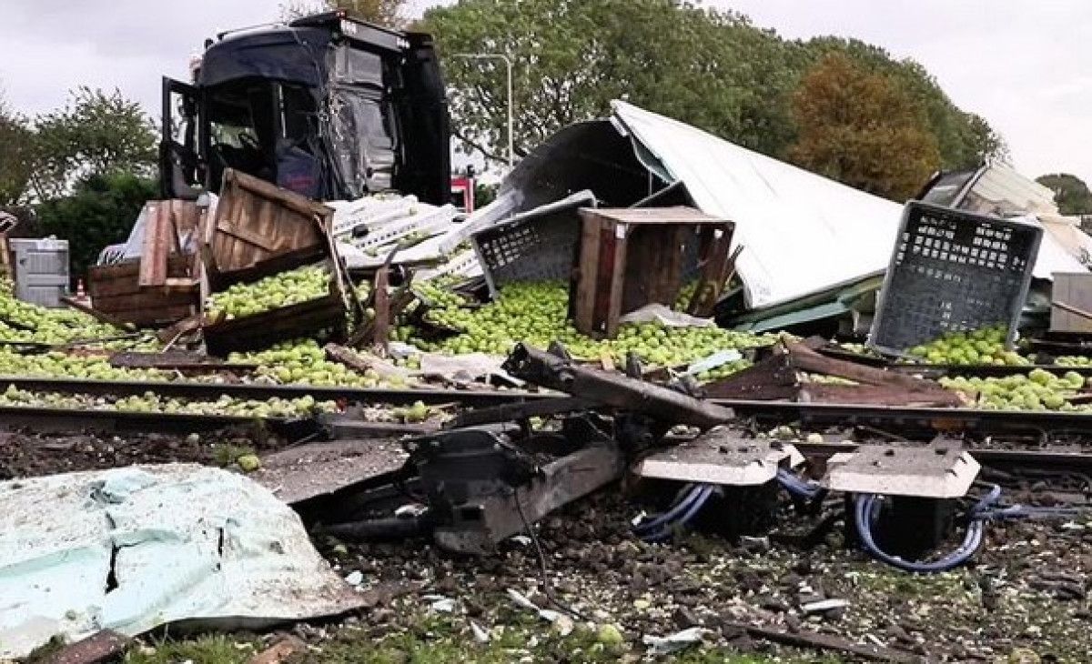Hollanda'nın Gelderland iline bağlı Meteren köyünde armut yüklü bir tır, dar bir viraj nedeniyle hemzemin geçitte mahsur kaldı.
